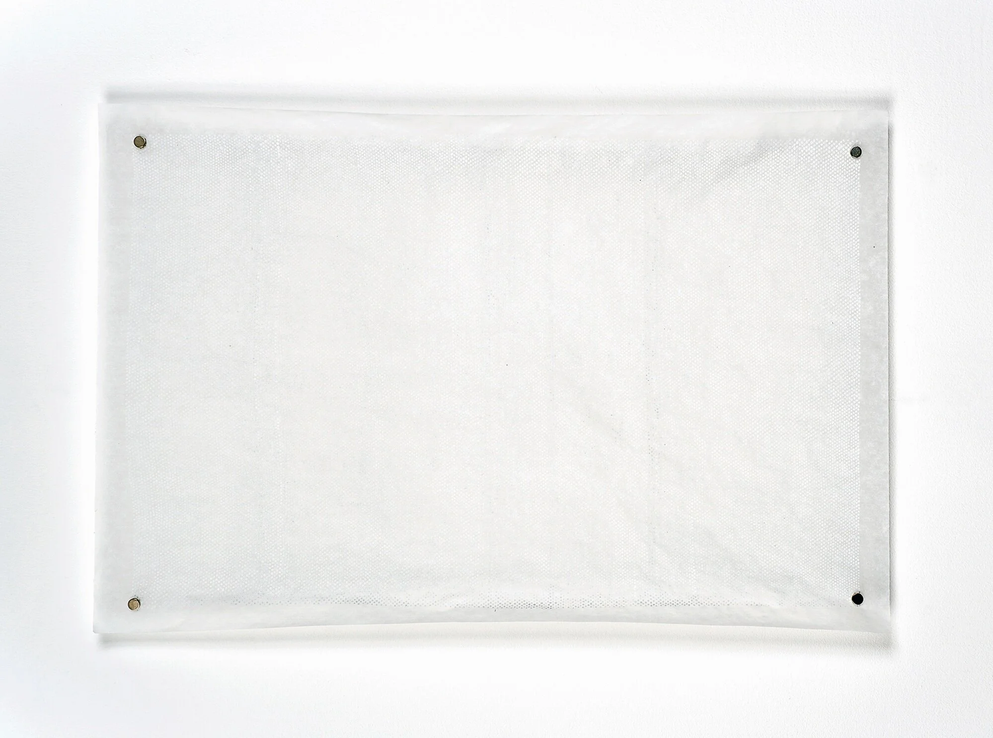The Magna Carta is ‘mimicked’ in this work by retaining the actual dimensions and material of the original document. The point-like pattern made with the emulsion correction pen suggests where the text would appear in the actual Magna Carta. Part of an ongoing series of works called Screened Page.